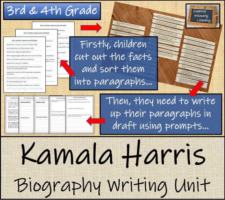 A biography writing unit about the life and career of Kamala Harris, who became the vice president of the United States in January 2021. The NO PREP unit has been split into four separate lessons and is perfect for students in third grade or fourth grade. Students will learn about the famous figure whilst working on their comprehension skills and developing their creative writing.