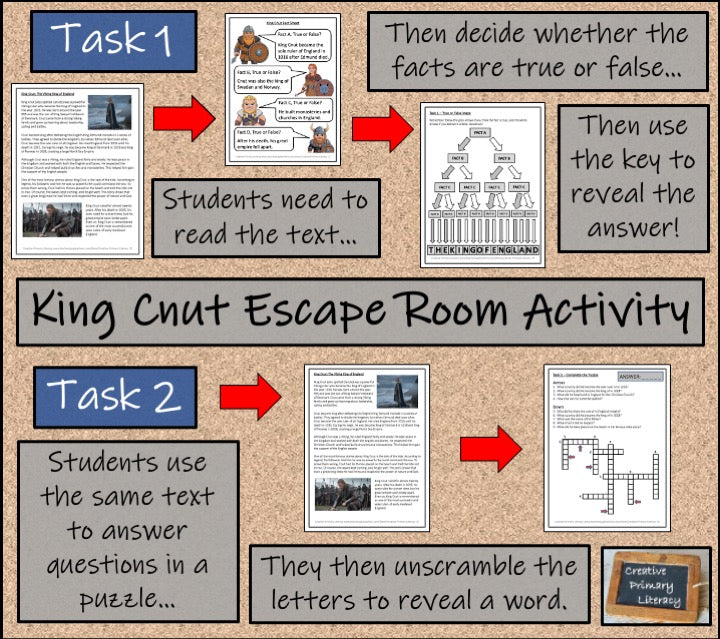 An Escape Room activity about the Viking king of England, King Cnut. Ideal for fifth grade or sixth grade, the activity is perfect for group work, starting a new topic, team-building activities or for a fun, engaging and interactive lesson. The activity can be used in English class as it incorporates some ELA skills or in Social Studies.
