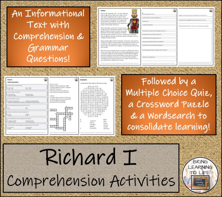 A close reading passage with a teacher presentation, comprehension and grammar questions, a multiple choice quiz, a crossword puzzle and a wordsearch about the life of the famous King of England, Richard I, better known as Richard the Lionheart.