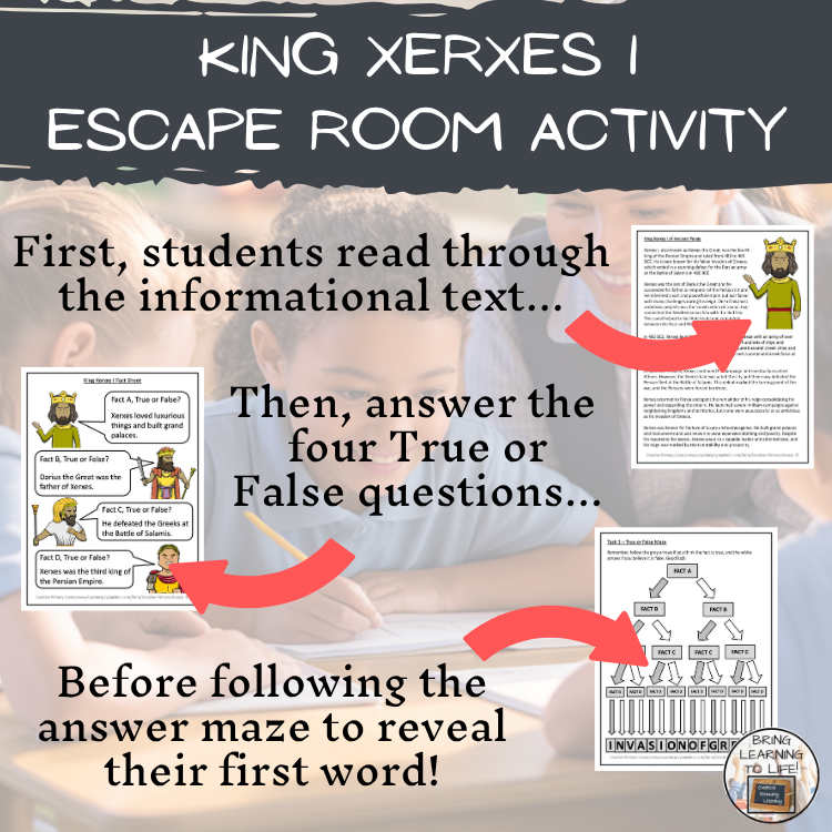 In Task 1 students will read an informational text about King Xerxes I and then find their way through a maze by answering true or false comprehension questions. If they answer the questions correctly they will reveal their first word.