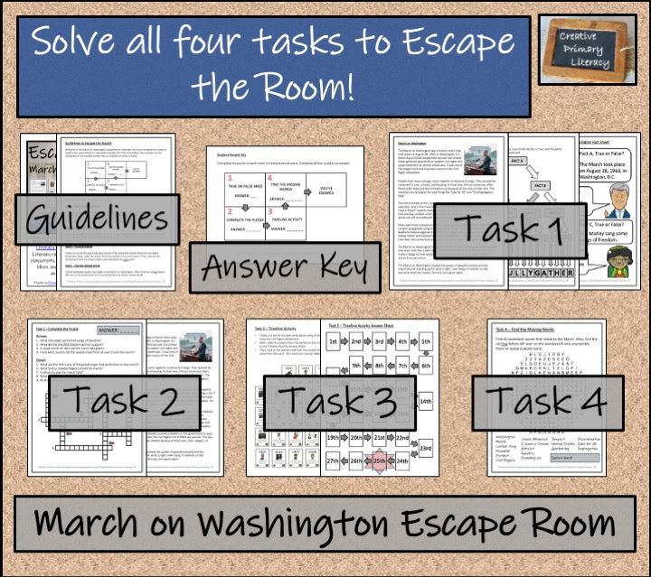 A March on Washington Escape Room activity. Ideal for fifth grade or sixth grade, the activity is perfect for group work, starting a new Civil Rights topic, Black History Month, team-building activities or for a fun, engaging and interactive lesson. The activity can be used in English class as it incorporates some ELA skills or in Social Studies.