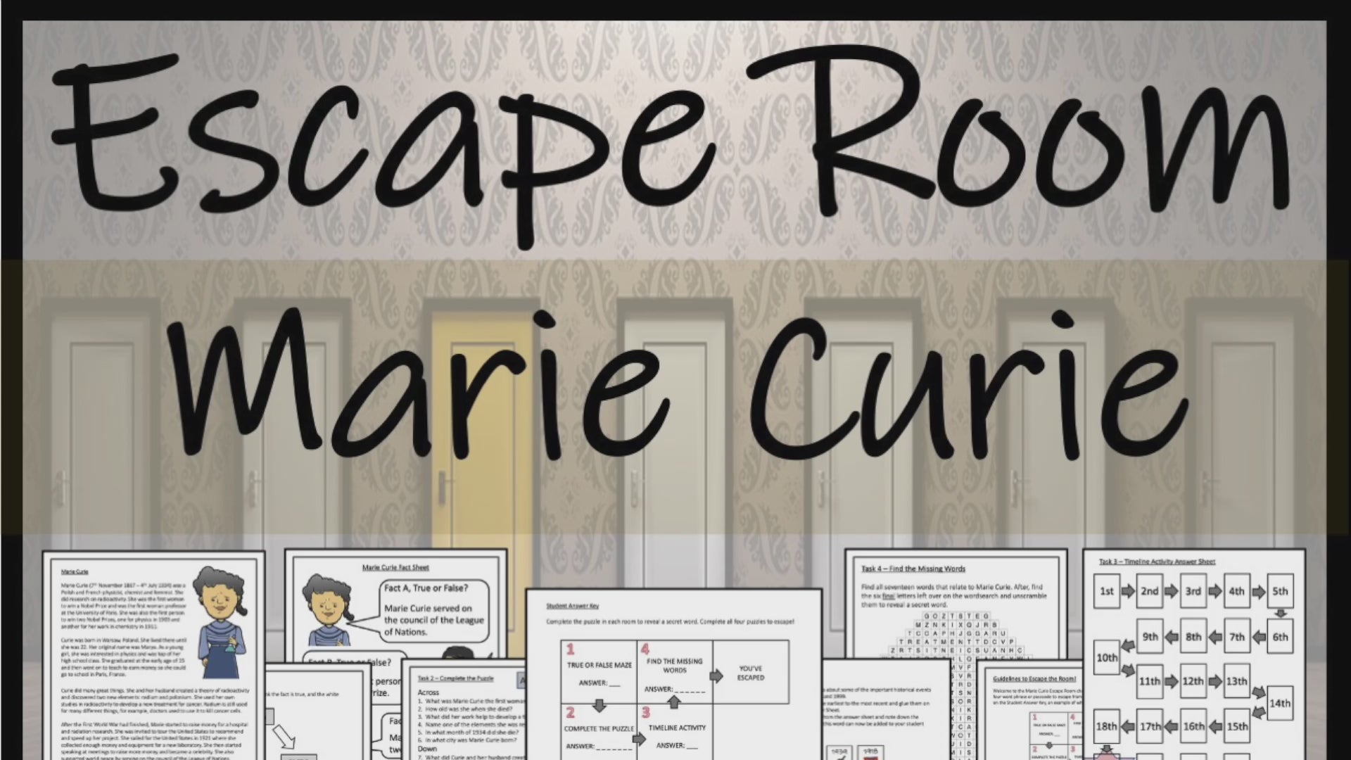 A Marie Curie Escape Room activity. Ideal for fifth grade or sixth grade, the activity is perfect for group work, a science project, a women's history month project, team-building activities or for a fun, engaging and interactive lesson. The activity can be used in English class as it incorporates some ELA skills or in Social Studies.