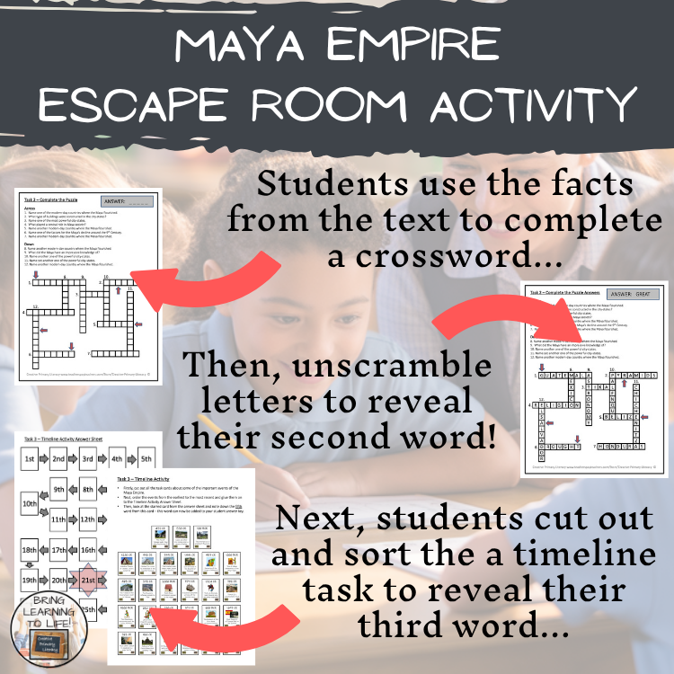 A Maya Empire Escape Room activity. Ideal for fifth grade or sixth grade, the activity is perfect for group work, starting a new Mesoamerica history topic, team-building activities or for a fun, engaging and interactive lesson. The activity can be used in English class as it incorporates some ELA skills or in Social Studies.