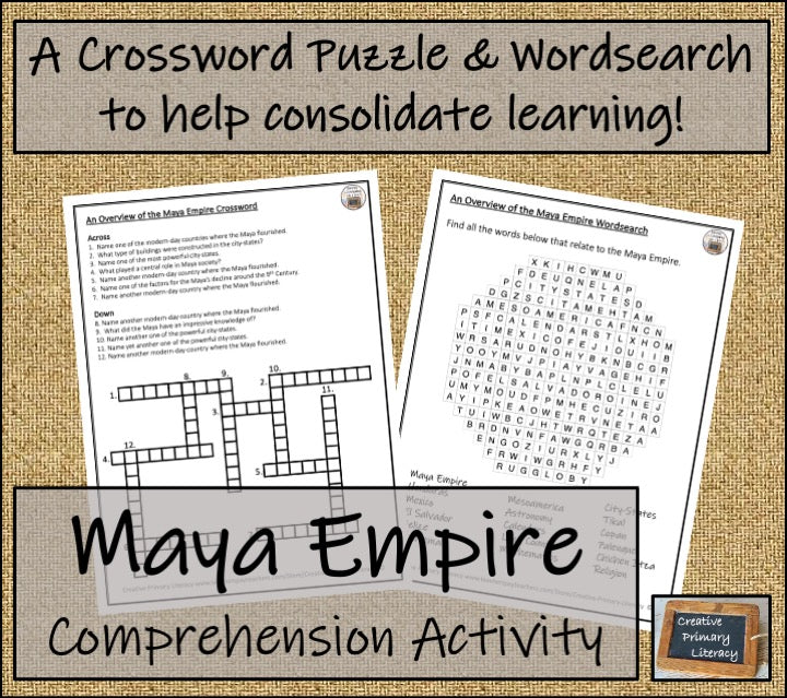 An informational writing unit about the Maya Empire. The unit focuses on key facts about the advances in astronomy, architecture and mathematics; religion within the empire; and the eventual downfall. The unit has been split into three separate lessons and is perfect for students in fifth grade and sixth grade. A crossword puzzle and wordsearch activity also come with the resource to consolidate learning.