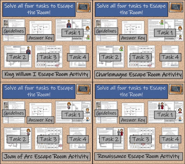 Four individual Escape Room activities about the following famous figures or key periods from the Middle Ages: