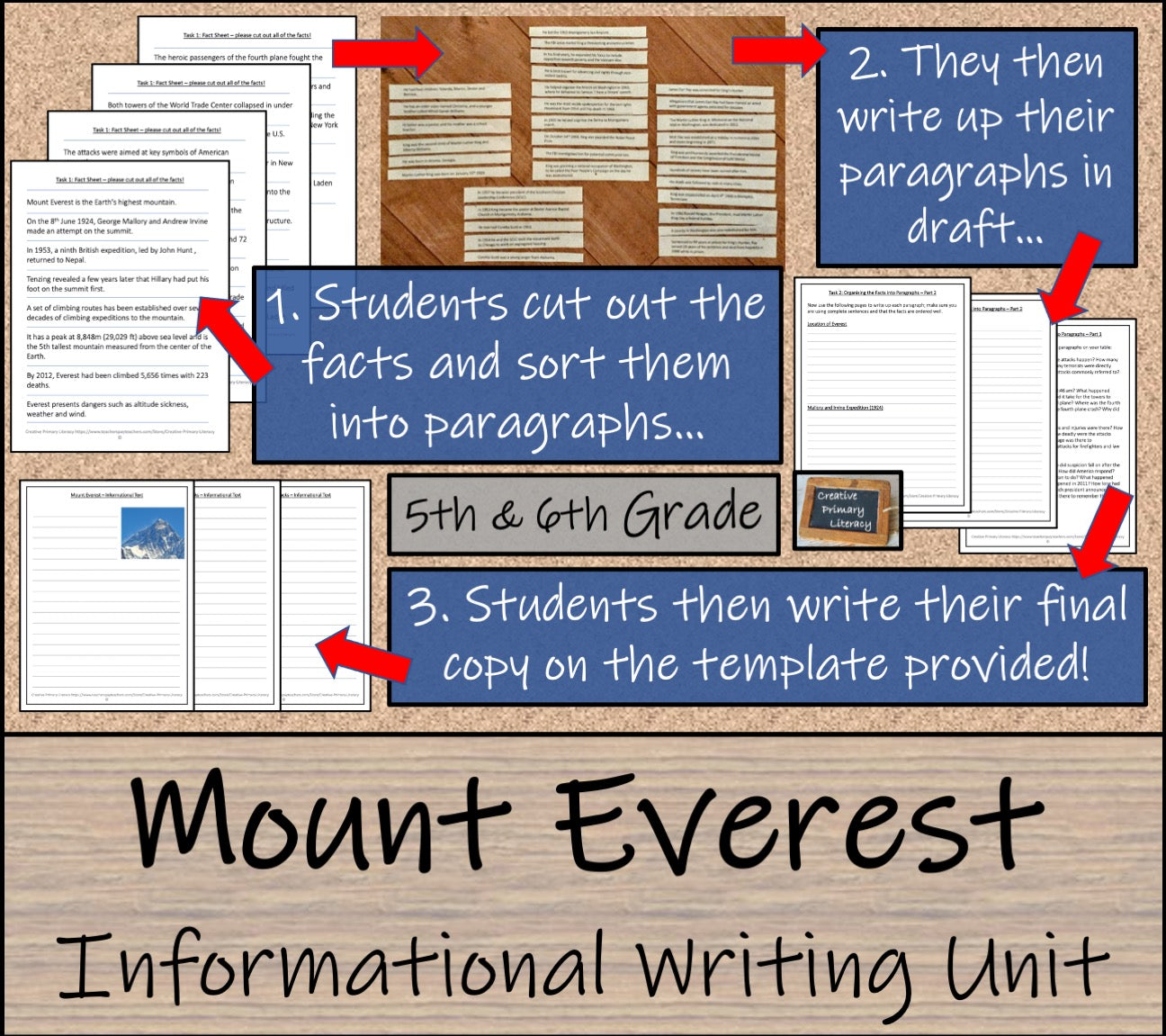 An informational writing unit about Mount Everest. The unit looks at key facts about the world's highest mountain, then looks at its history; from the first summit attempts until the present day problems that have been caused by human waste. It has been split into three separate lessons and is perfect for students in fifth grade and sixth grade.