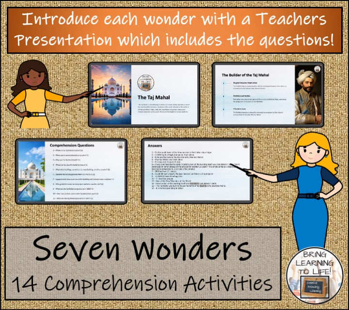 Each activity requires NO PREP; they have a body of text that students need to read through thoroughly; then they can use the text to find the comprehension and grammar answers. All texts then have extension activities for those fast finishers and answers, for teacher use, are on the final page of the document. A teacher presentation also comes withe each resource to introduce each wonder.