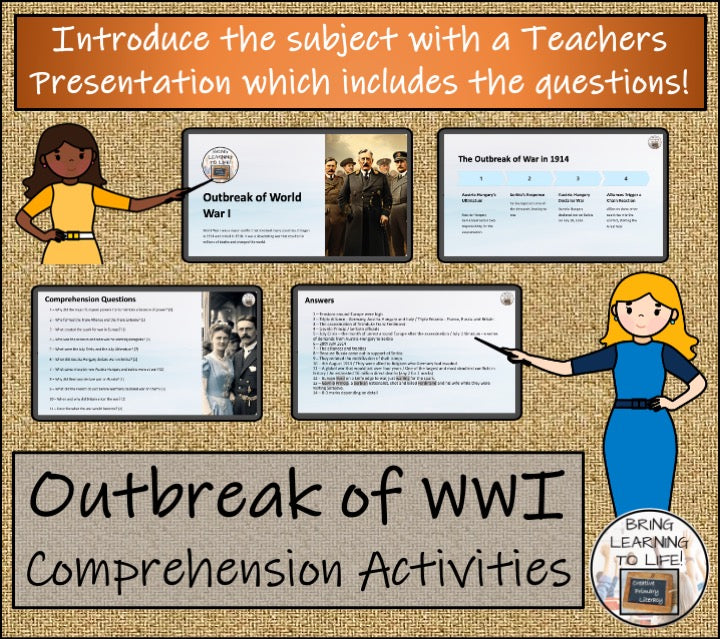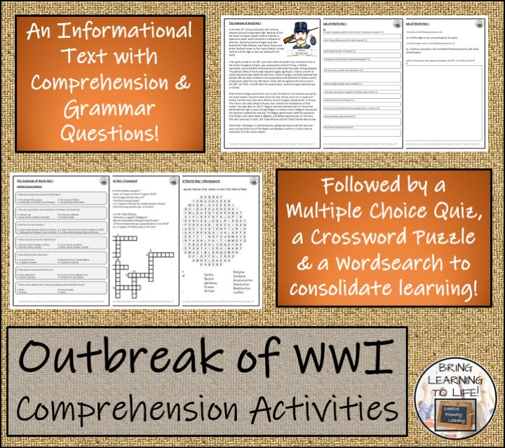 A First World War close reading passage with a teacher presentation, comprehension and grammar questions, a multiple choice quiz, a crossword puzzle and a wordsearch about the assassination of Archduke Franz Ferdinand, the alliance and treaties around Europe, and the eventual outbreak of war.
