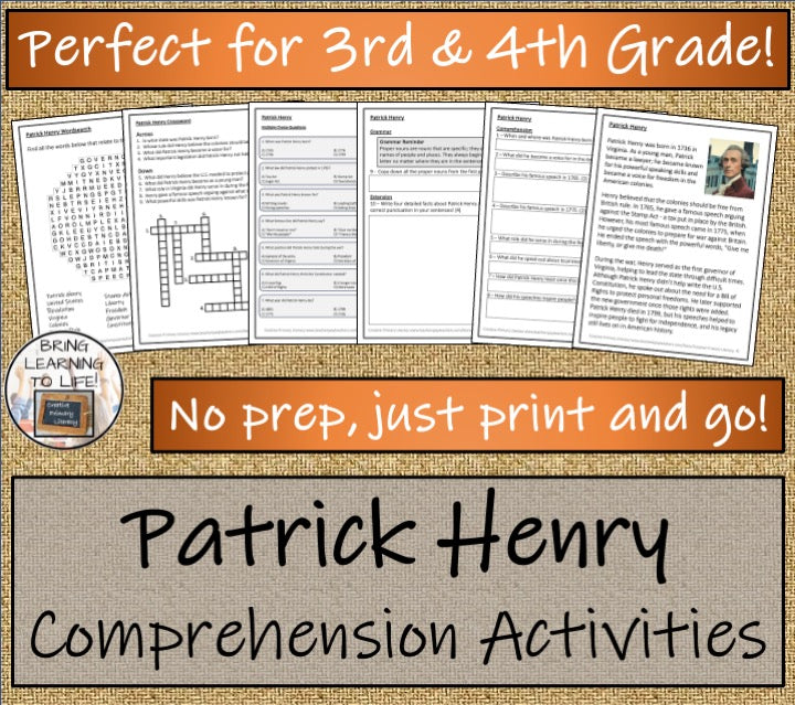 A close reading passage with a teacher presentation, comprehension and grammar questions, a multiple choice quiz, a crossword puzzle and a wordsearch about the famous American patriot, Patrick Henry - who was a vocal spokesman against British rule before and during the American Revolutionary War.