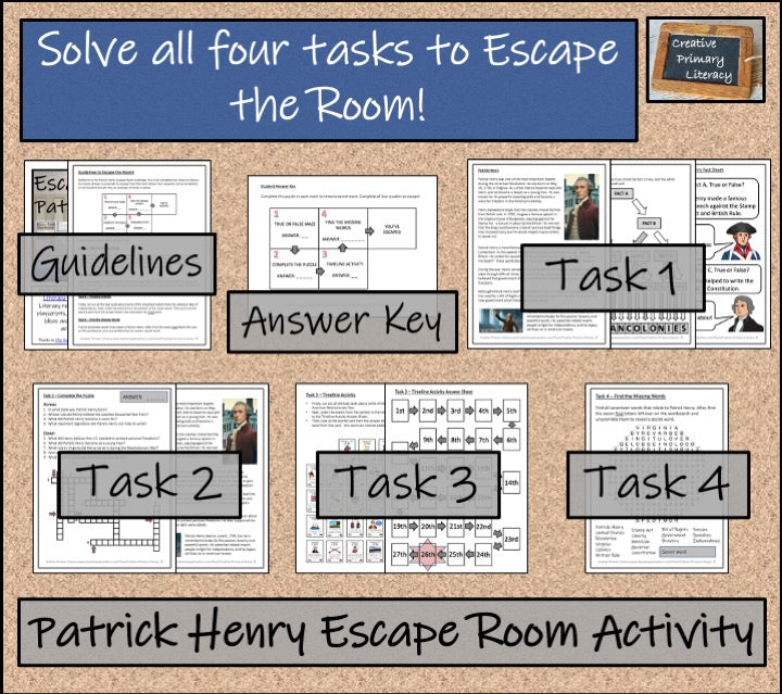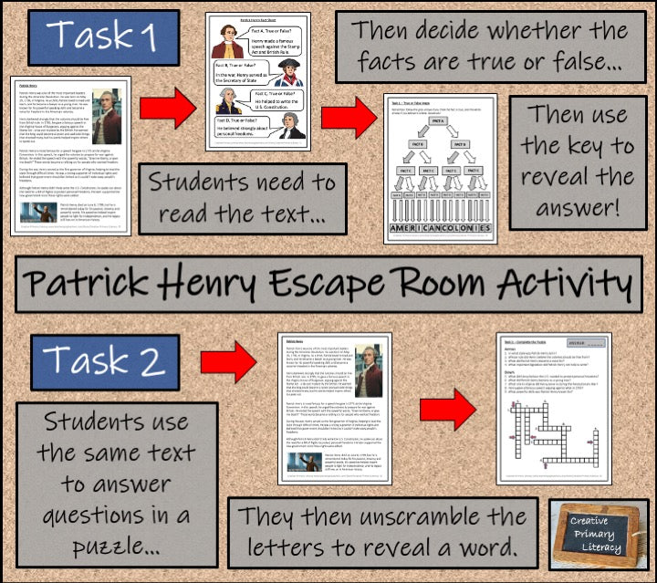 An Escape Room activity about Patrick Henry. Ideal for fifth grade or sixth grade, the activity is perfect for group work, starting a new American Revolutionary War topic, team-building activities or for a fun, engaging and interactive lesson. The activity can be used in English class as it incorporates some ELA skills or in Social Studies.