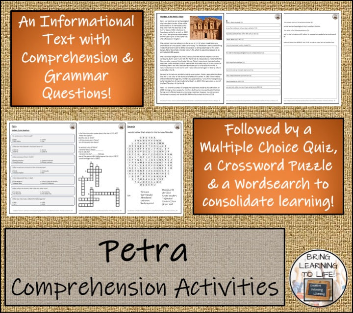 A close reading passage with a teacher presentation, comprehension and grammar questions, a multiple choice quiz, a crossword puzzle and a wordsearch about the ancient city of Petra in Jordan, which is one of the New Seven Wonders of the World.