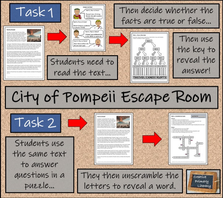 In Task 1 students will read an informational text about Pompeii and then find their way through a maze by answering true or false comprehension questions. If they answer the questions correctly they will reveal their first word.