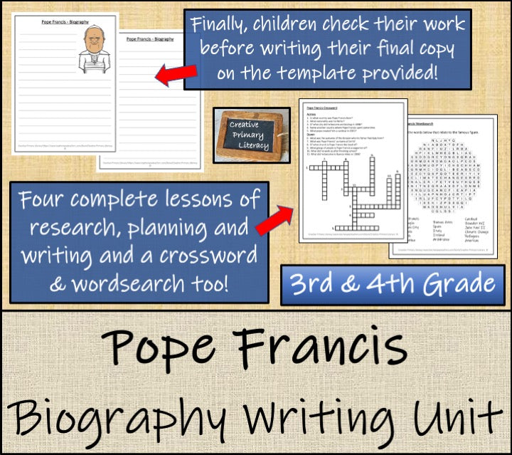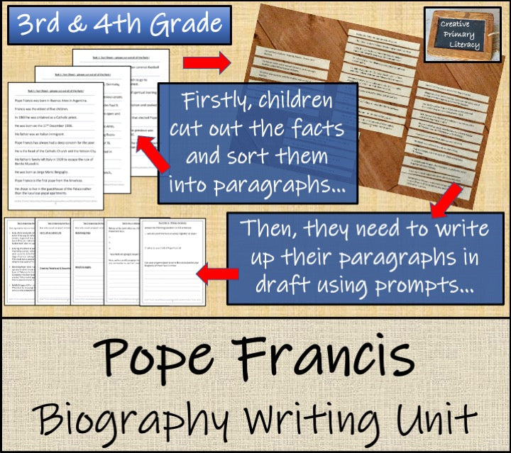 A biography writing unit about the leader of the Catholic Church, Pope Francis. The NO PREP unit has been split into four separate lessons and is perfect for students in third grade or fourth grade.