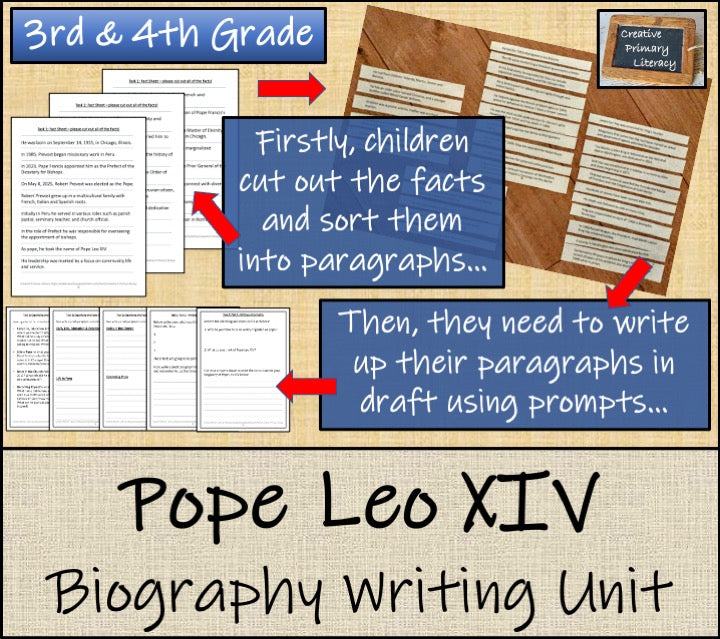 A biography writing unit about the leader of the Catholic Church, Pope Leo XIV. The NO PREP unit has been split into four separate lessons and is perfect for students in third grade or fourth grade.
