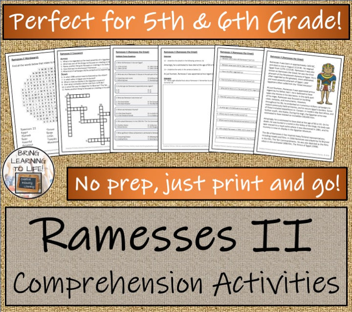 A close reading passage with a teacher presentation, comprehension and grammar questions, a multiple choice quiz, a crossword puzzle and a wordsearch about the great pharaoh of Ancient Egypt, Ramesses II or Ramesses the Great.