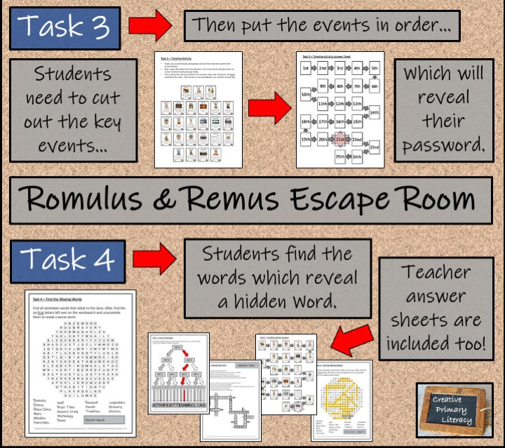 An Escape Room activity about the Roman story or myth of Romulus and Remus, who went on to found the great city of Rome. Ideal for fifth grade or sixth grade, the activity is perfect for group work, starting a new ancient history topic, team-building activities or for a fun, engaging and interactive lesson. The activity can be used in English class as it incorporates some ELA skills or in Social Studies.