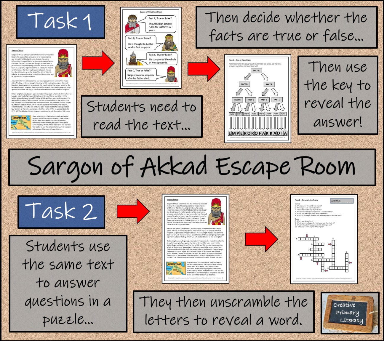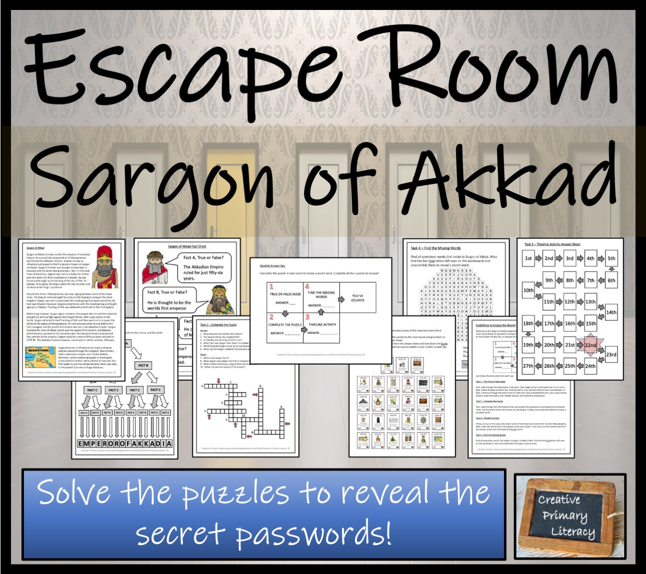 A Sargon of Akkad and Ancient Mesopotamia Escape Room activity. Ideal for fifth grade or sixth grade, the activity is perfect for group work, starting a new ancient history topic, team-building activities or for a fun, engaging and interactive lesson. The activity can be used in English class as it incorporates some ELA skills or in Social Studies.