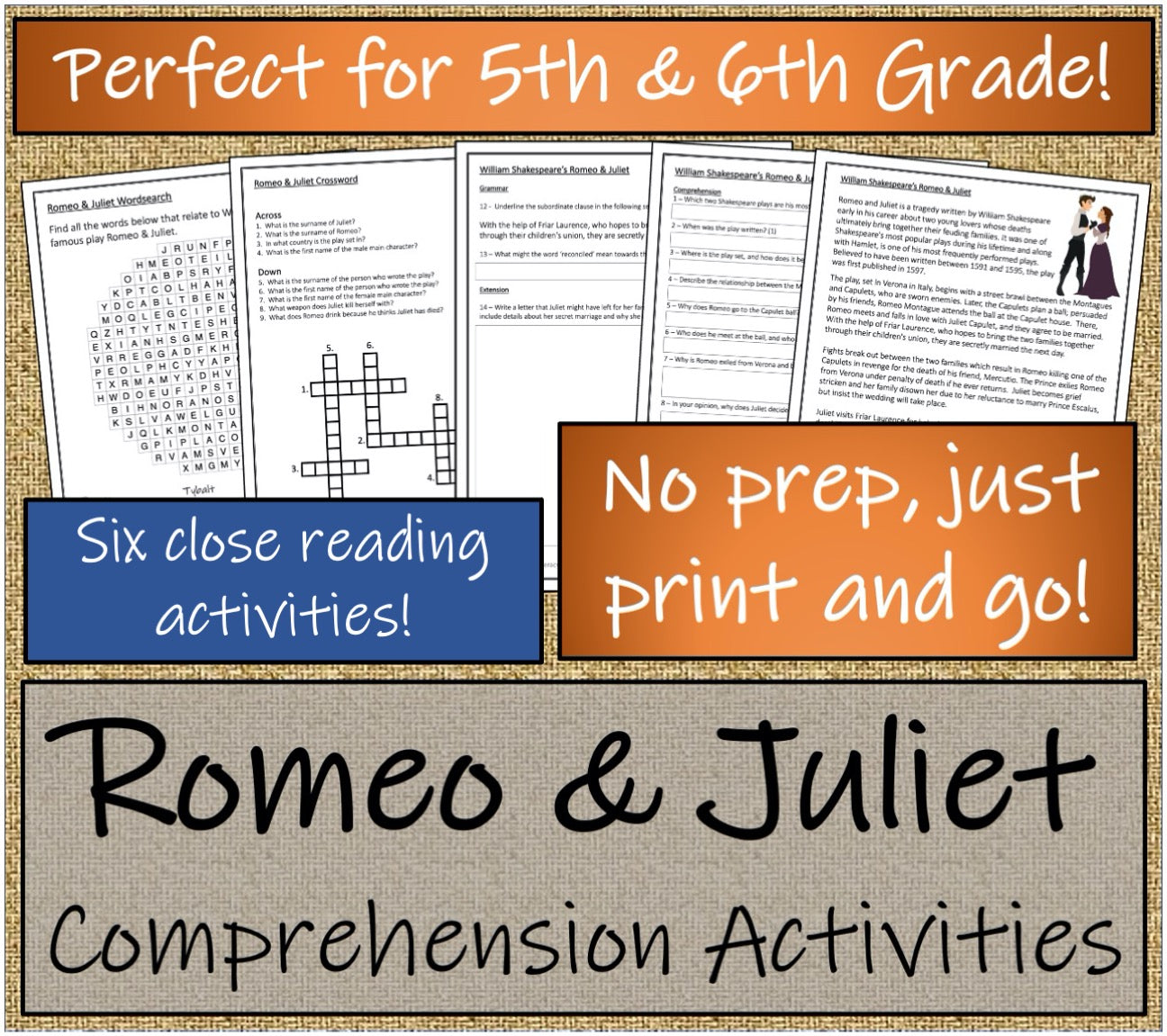 A book with six close reading passages focused on William Shakespeare and five of his famous plays. The NO PREP reading comprehension activities are perfect for students in fifth grade or sixth grade. Students will learn key facts whilst developing their comprehension skills.