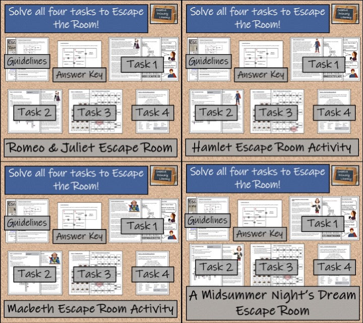 Four individual Escape Room activities about the following famous plays by William Shakespeare: