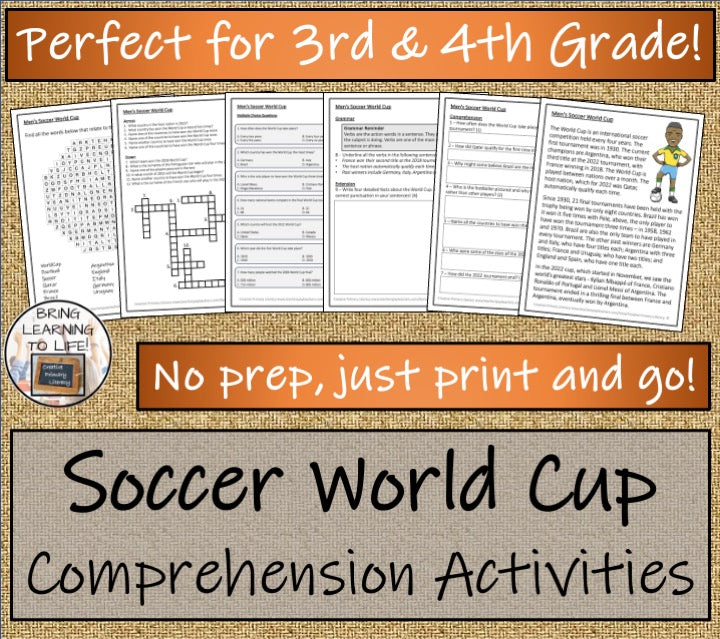 The NO PREP informational text worksheets are perfect for students in third grade or fourth grade. Students will learn key facts about the World Cup whilst working on their comprehension skills.