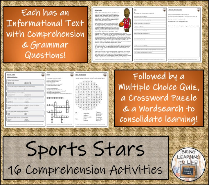 A bundle of sixteen close reading activities, each with a teacher presentation, comprehension and grammar questions, a multiple choice quiz, a crossword puzzle and a wordsearch about some inspirational sport stars from history.
