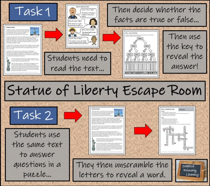 In Task 1 students will read an informational text about the Statue of Liberty and then find their way through a maze by answering true or false comprehension questions. If they answer the questions correctly they will reveal their first word.