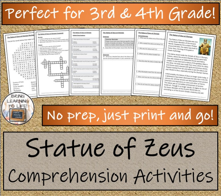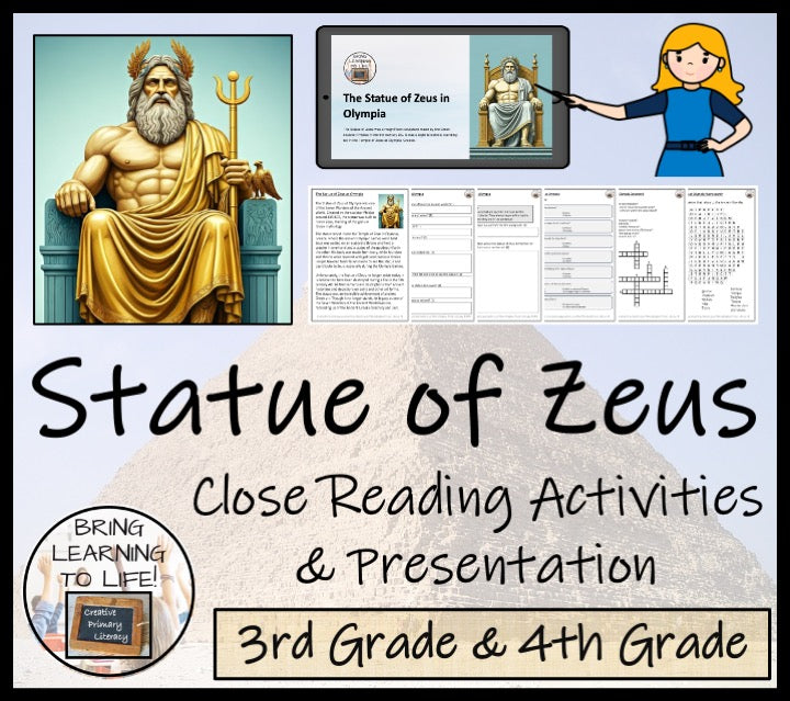 A close reading passage with a teacher presentation, comprehension and grammar questions, a multiple choice quiz, a crossword puzzle and a wordsearch about one of the Seven Ancient Wonders of the World, the Statue of Zeus in Olympia.