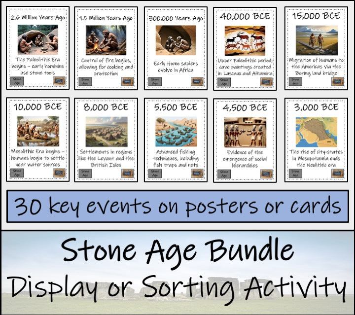 Finally, there is a Stone Ages Timeline Activity and Display. It is perfect for introducing students to the some of the key events and advancements from the period. There are 33 posters or task cards.
