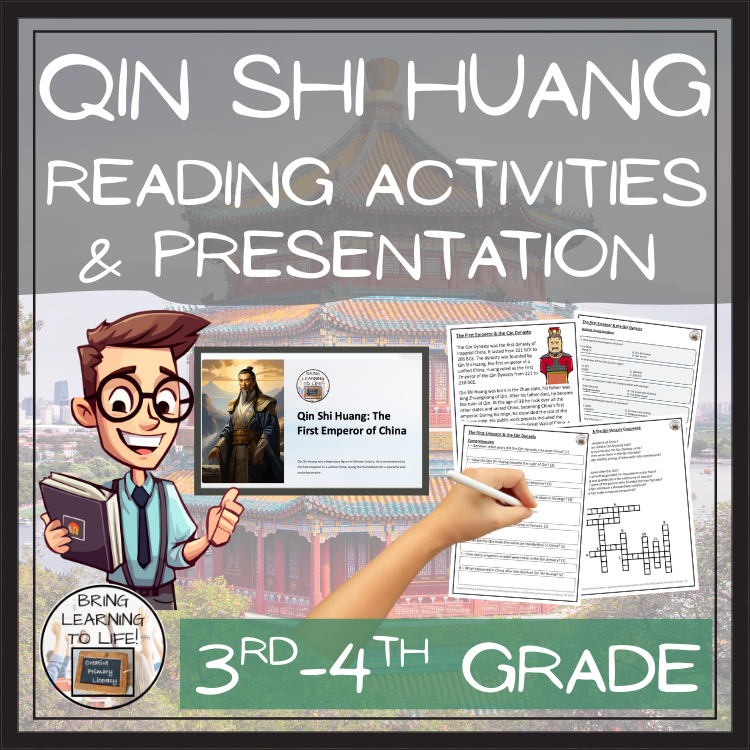A close reading passage with an informational text, a teacher presentation, comprehension and grammar questions, a multiple choice quiz, a crossword puzzle and a wordsearch about the first emperor of Ancient China, Qin Shi Huang, and the Qin Dynasty which he founded.