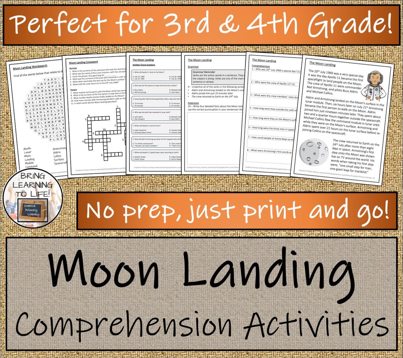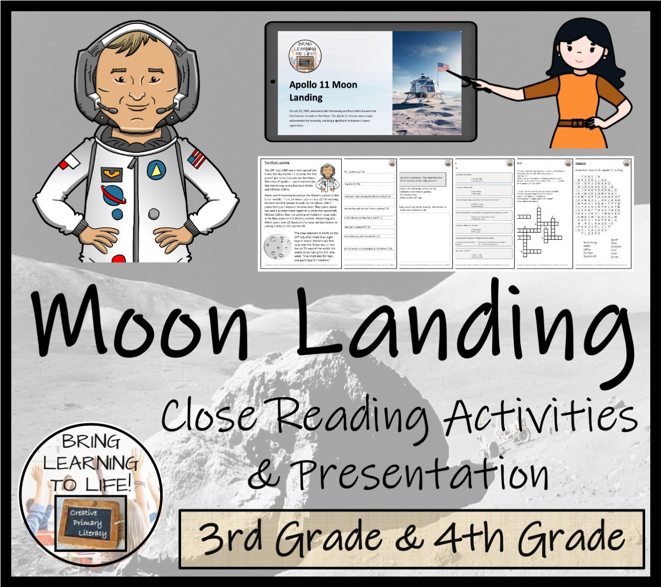 A close reading passage with a teacher presentation, comprehension and grammar questions, a multiple choice quiz, a crossword puzzle and a wordsearch about the famous Moon landing of Neil Armstrong and Buzz Aldrin in the Apollo 11 mission.