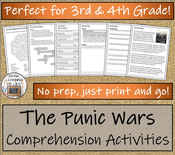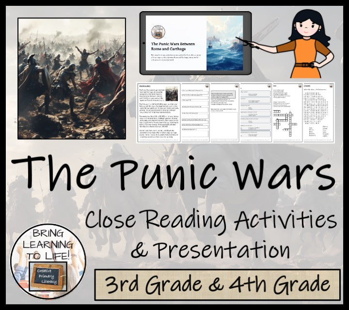 A close reading passage with a teacher presentation, comprehension and grammar questions, a multiple choice quiz, a crossword puzzle and a wordsearch about the three Punic Wars fought between Ancient Rome and Carthage.