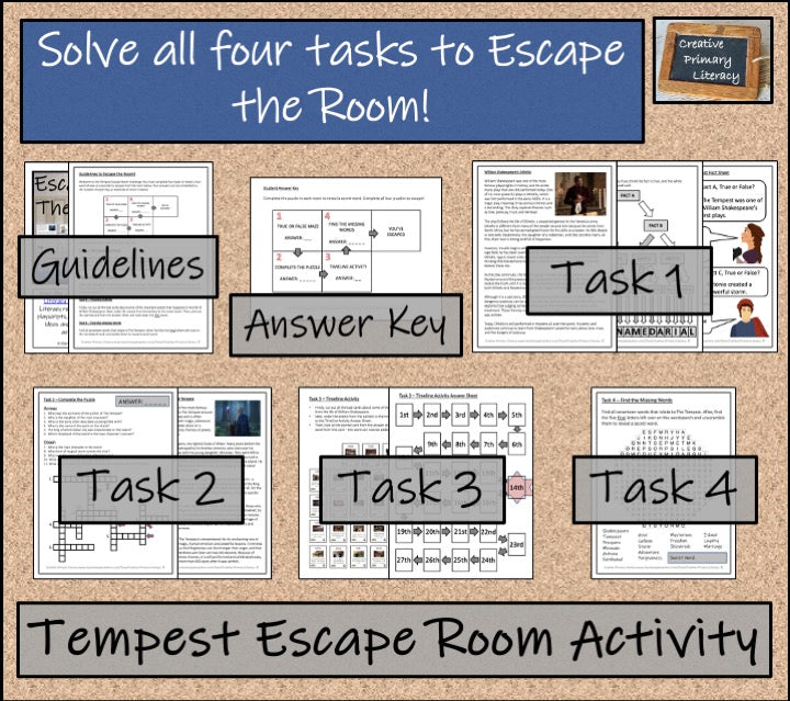 An Escape Room activity about William Shakespeare's famous play - The Tempest. Ideal for fifth grade or sixth grade, the activity is perfect for group work, starting a new topic, team-building activities or for a fun, engaging and interactive lesson. The activity can be used in English class as it incorporates some ELA skills or in Social Studies.