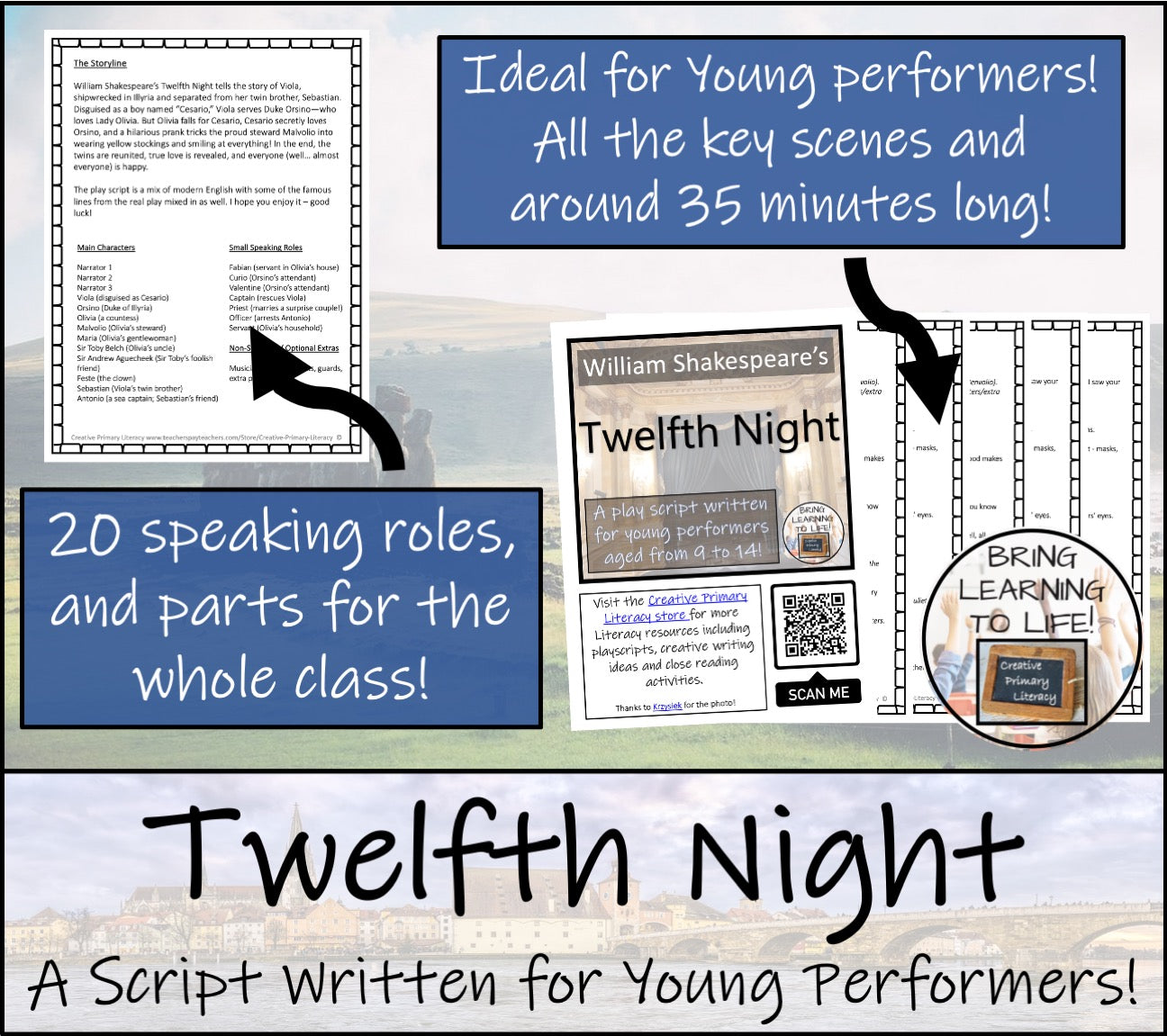 This is a play script for William Shakespeare's Twelfth Night, which has been rewritten for students from third grade to seventh grade. The script now also comes with a PDF teacher presentation to help you introduce the play and the characters to your students.