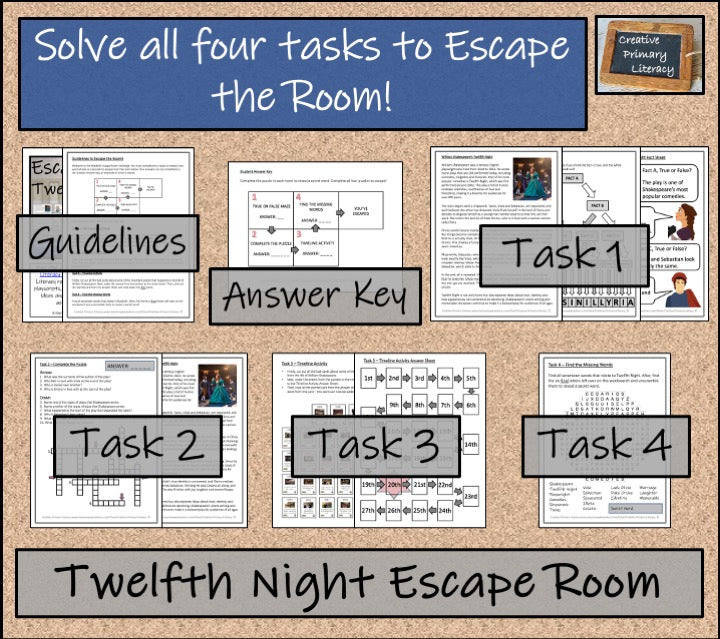 An Escape Room activity about William Shakespeare's famous play - Twelfth Night. Ideal for fifth grade or sixth grade, the activity is perfect for group work, starting a new topic, team-building activities or for a fun, engaging and interactive lesson. The activity can be used in English class as it incorporates some ELA skills or in Social Studies.