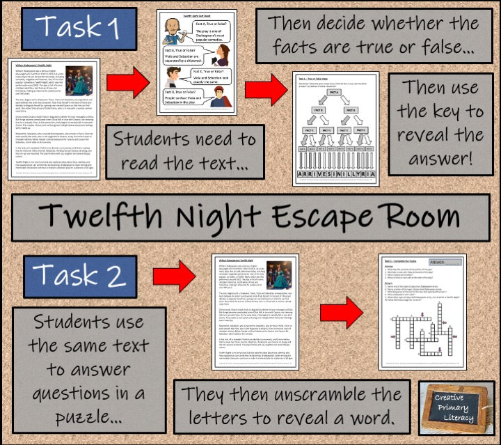 In Task 1 students will read an informational text about Twelfth Night and then find their way through a maze by answering true or false comprehension questions. If they answer the questions correctly they will reveal their first word.