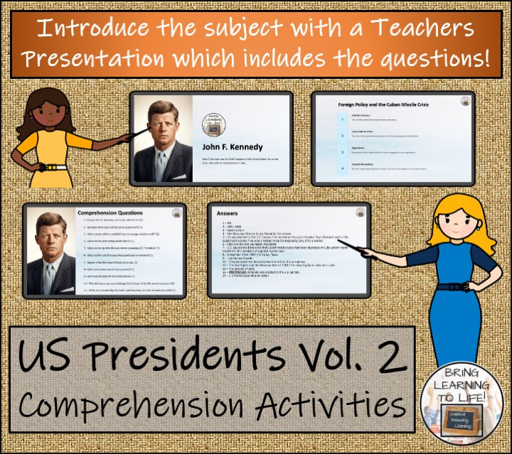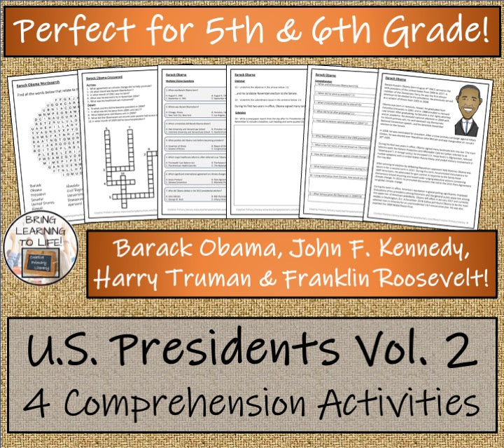 A presidential bundle of four close reading activities each with a teacher presentation, comprehension and grammar questions, a multiple choice quiz, a crossword puzzle and a wordsearch about four famous presidents: Franklin Roosevelt, Barack Obama, Harry Truman & John F. Kennedy.