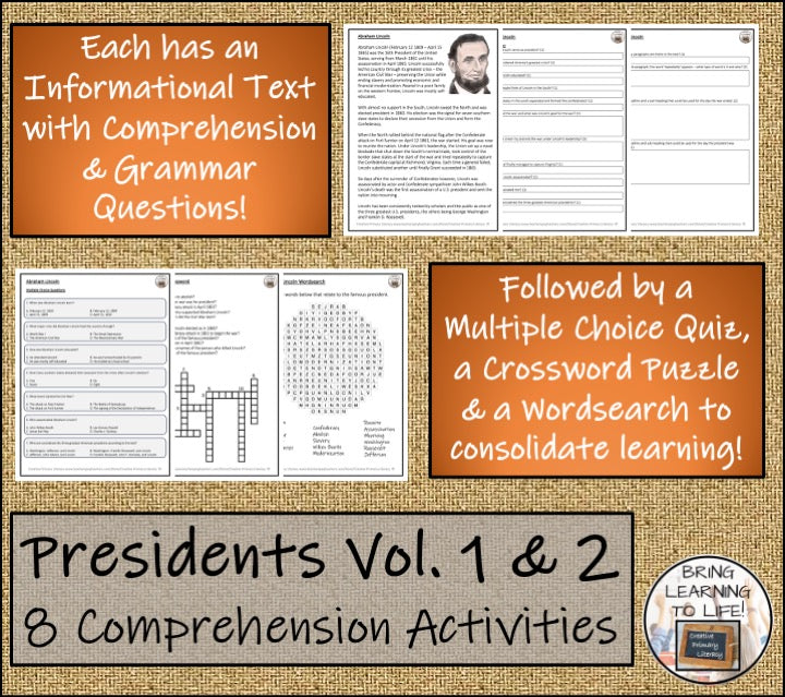 A presidential bundle of eight close reading activities each with a teacher presentation, comprehension and grammar questions, a multiple choice quiz, a crossword puzzle and a wordsearch about eight influential presidents from history.