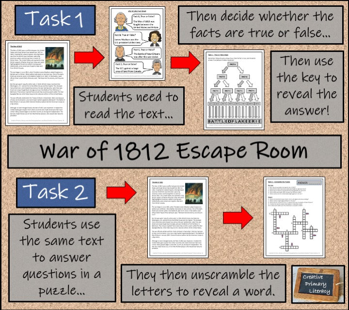 In Task 1 students will read an informational text about the War of 1812 and then find their way through a maze by answering true or false comprehension questions. If they answer the questions correctly they will reveal their first word.