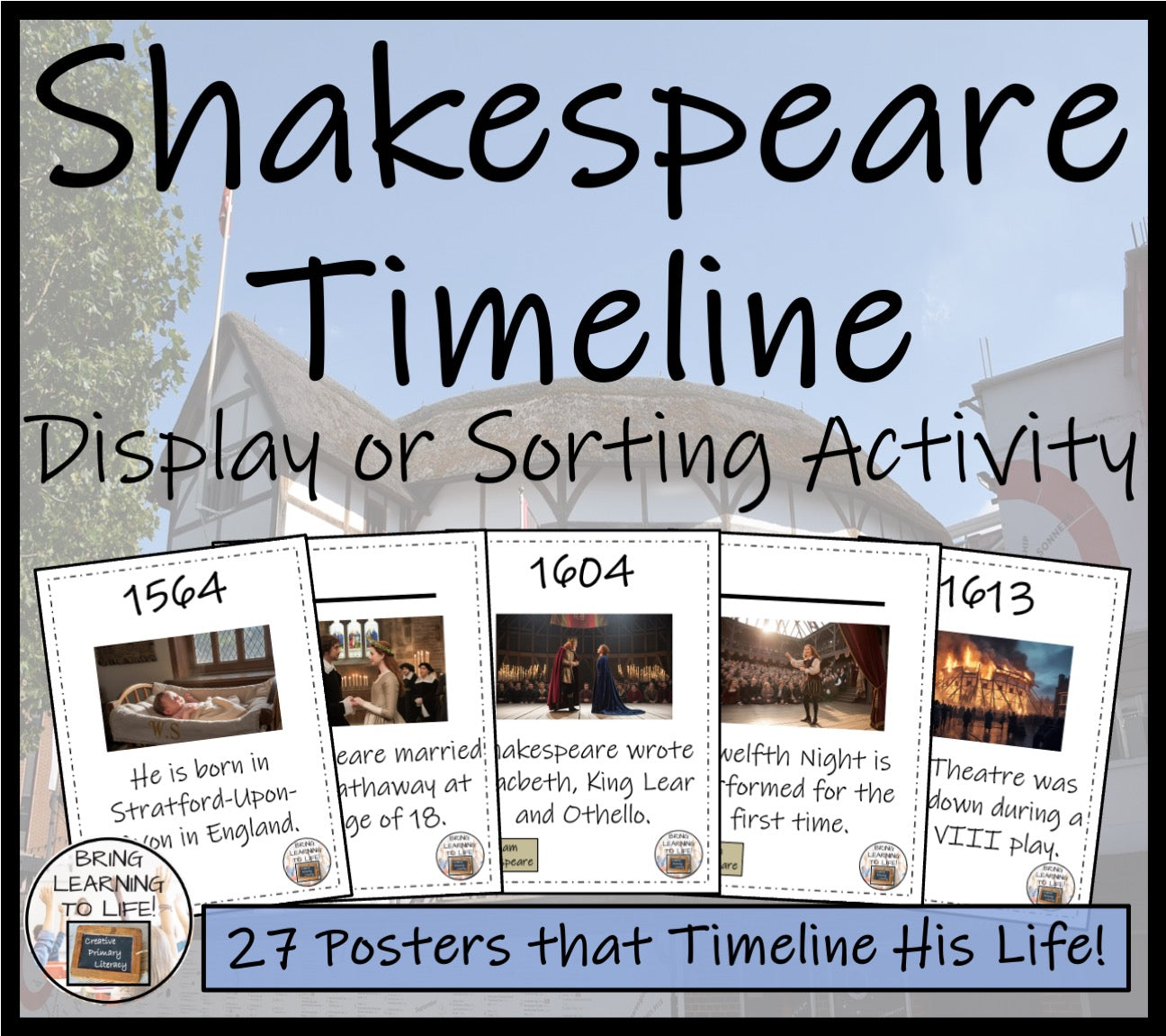 The posters look great as a display in the classroom and the cards are a brilliant introduction to Shakespeare. The displays and cards come both with dates and without dates, so the students can research the dates online before sorting the timeline. The cards look even better when laminated.