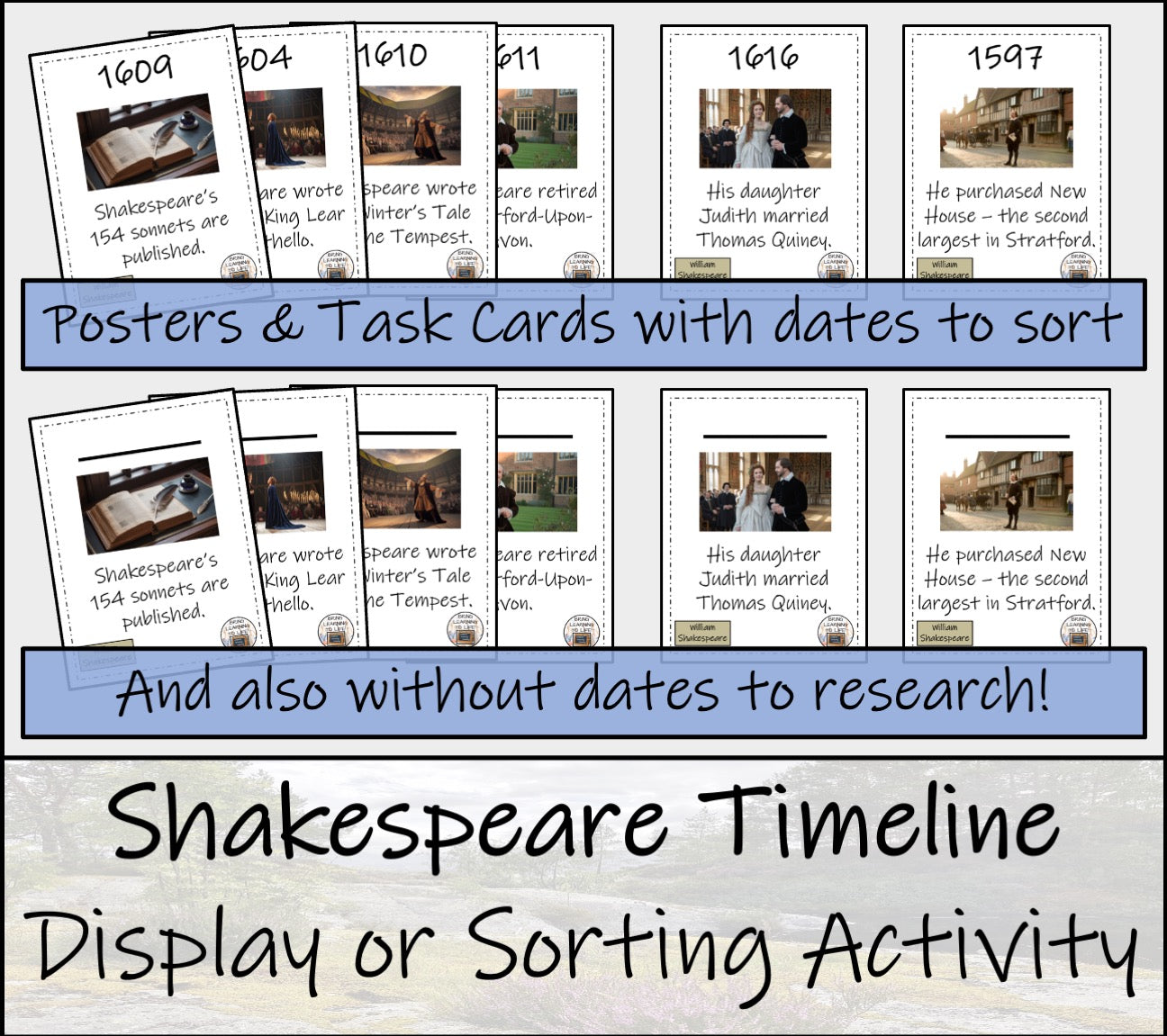 There are 27 posters or task cards that include many of the key events from his life including his marriage to Anne Hathaway and his co-ownership of The Globe, alongside the production of his famous plays including Macbeth, Hamlet, and Romeo and Juliet.