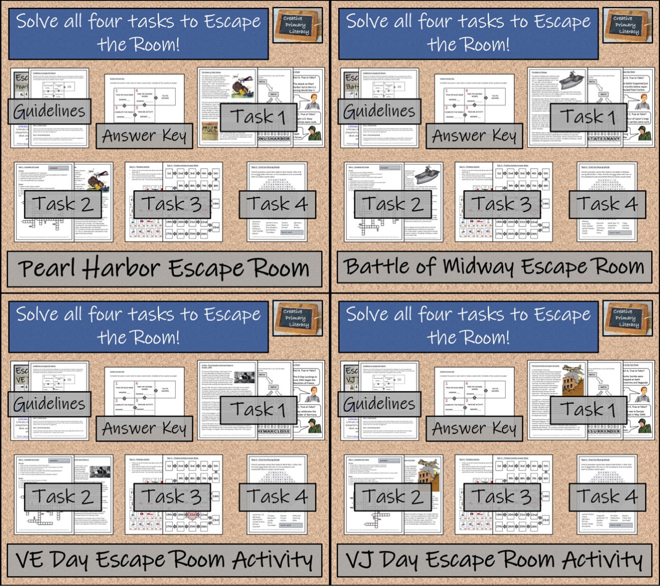 Four individual Escape Room activities about the following different areas or periods of World War II: