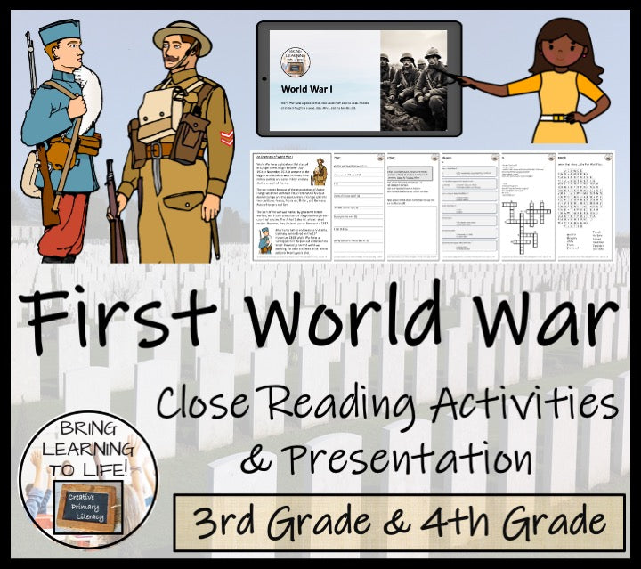 The NO PREP informational text worksheets are perfect for students in third grade or fourth grade. Students will learn key facts about the First World War whilst working on their comprehension skills.