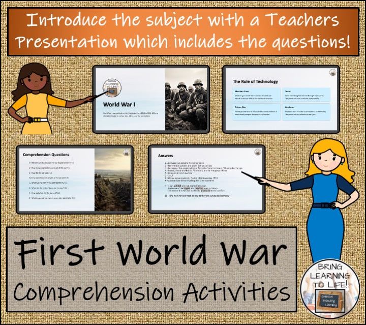 A First World War close reading passage with a teacher presentation, comprehension and grammar questions, a multiple choice quiz, a crossword puzzle and a wordsearch that gives an overview of World War I.