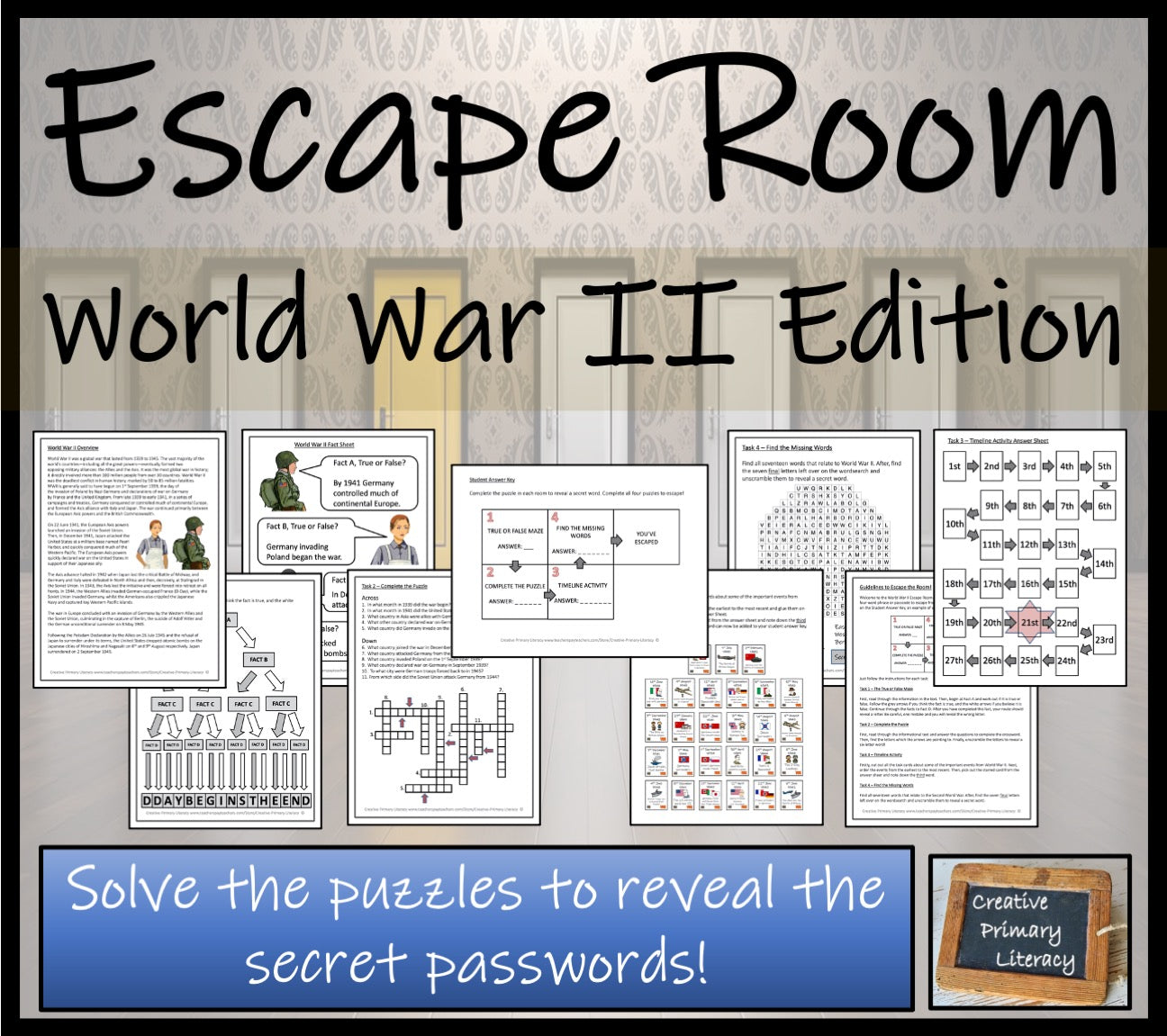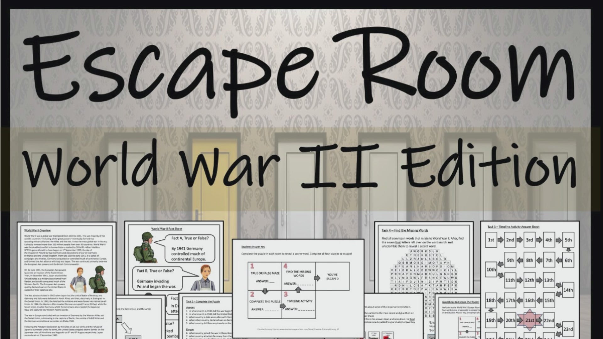 A Second World War Escape Room activity. Ideal for fifth grade or sixth grade, the activity is perfect for group work, starting a new history topic, team-building activities or for a fun, engaging and interactive lesson. The activity can be used in English class as it incorporates some ELA skills or in Social Studies.